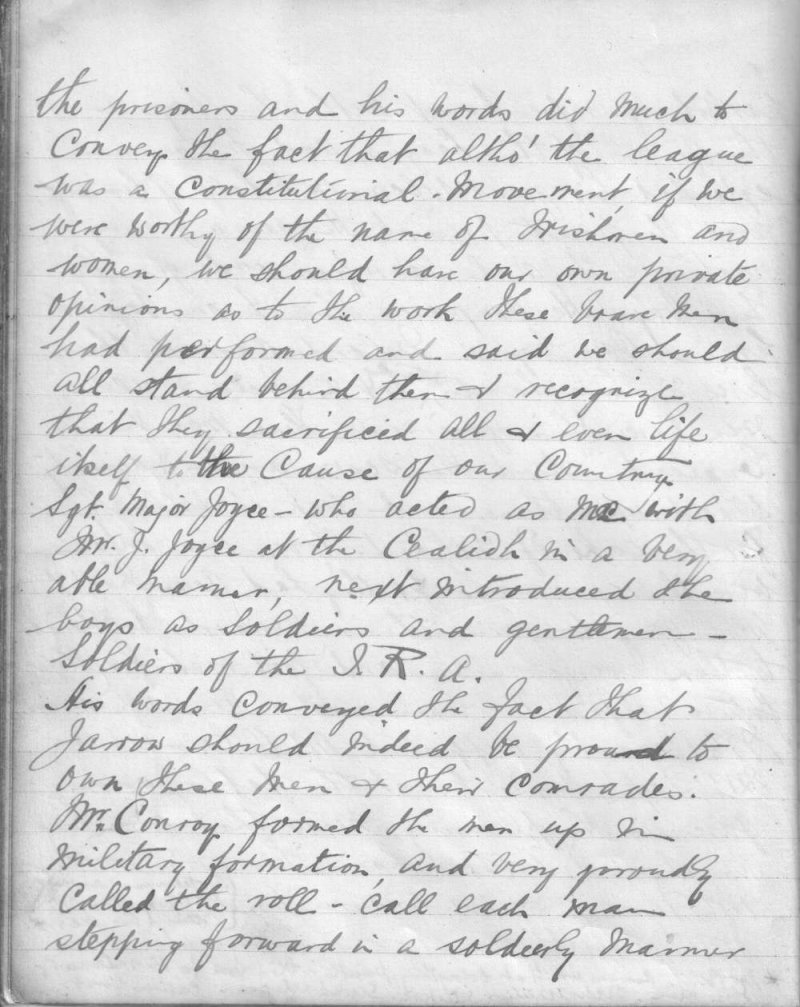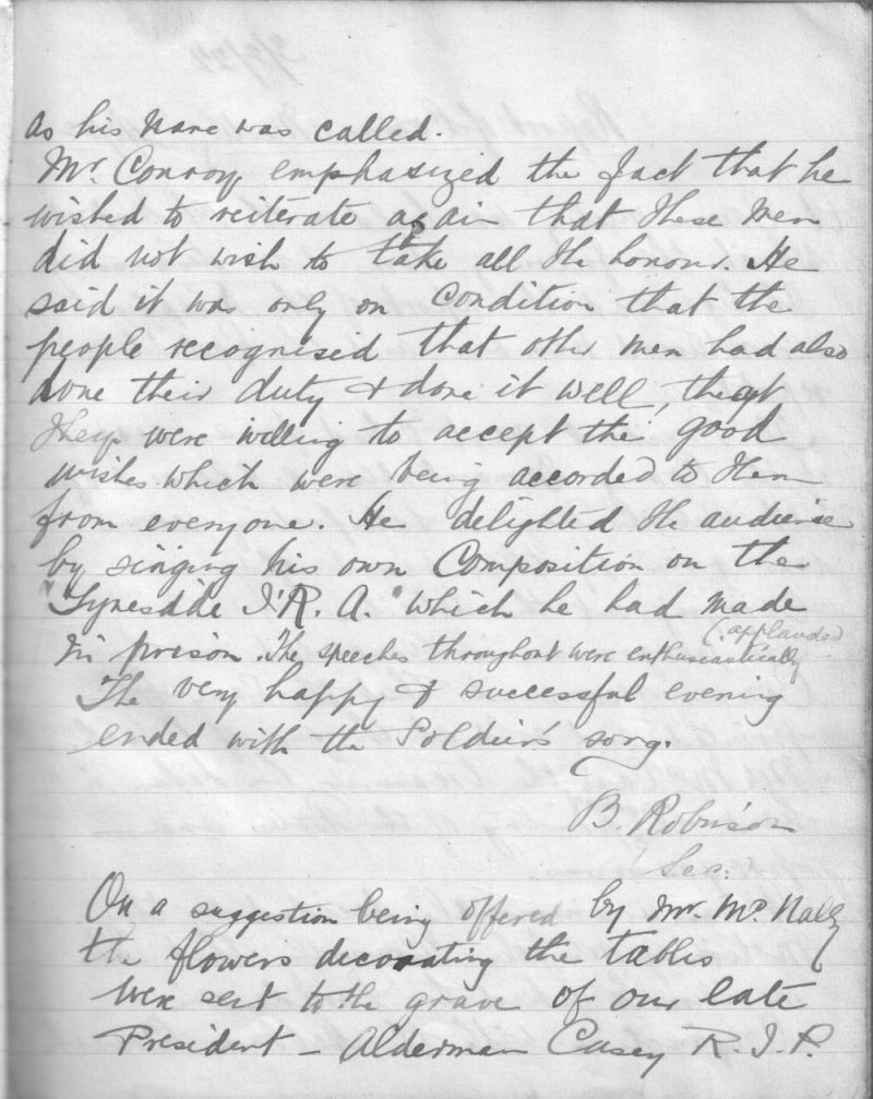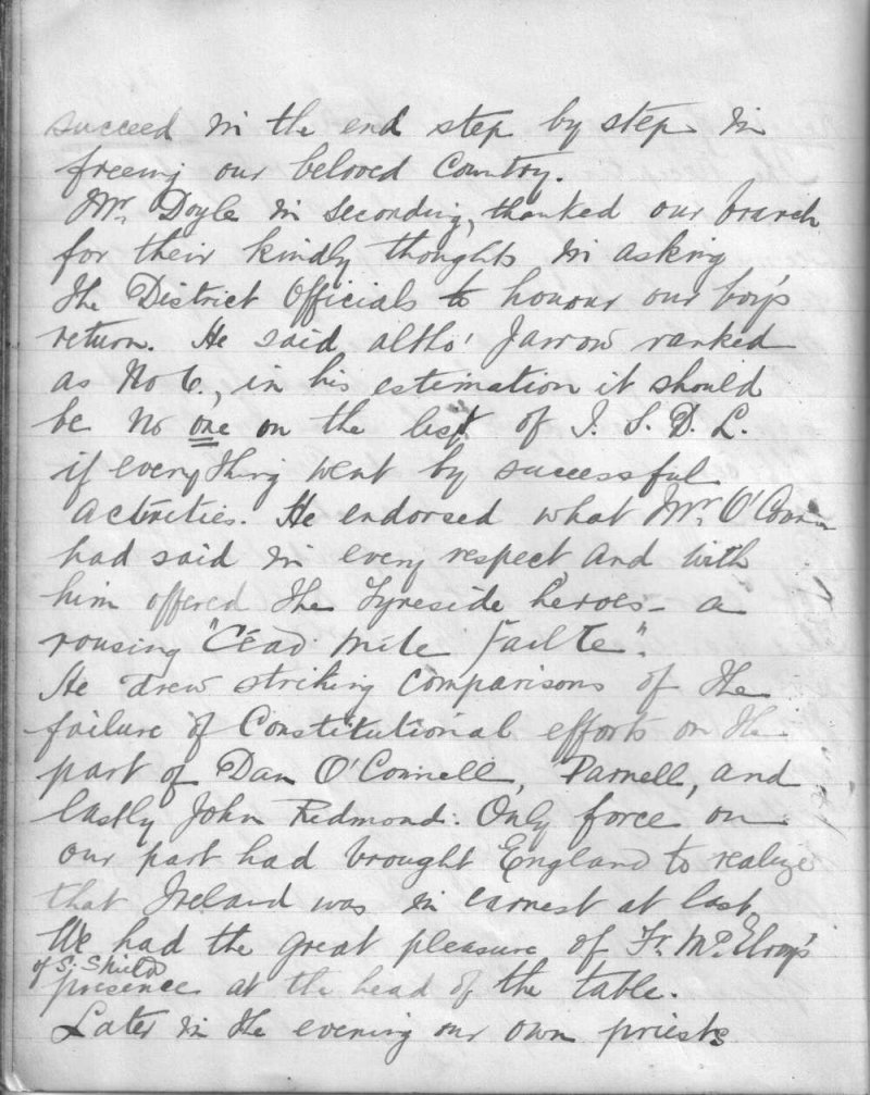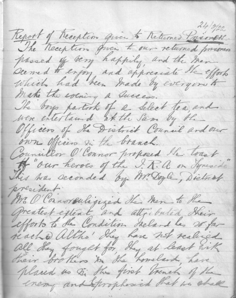 The following images are extracts from the minute book of the Jarrow Branch of the Irish Self-Determination League. They report on a reception for released prisoners held on or around 24th February 1922. Among those released were James Conroy, John McAlinden, Ed Kerrigan and Michael Wynne. A telegram from Michael Collins was read out to the meeting assuring that everything possible was being done to secure the release of other local men, Gilbert Barrington and Richard Purcell included, who were still being held in prison. They were eventually released on 3rd April 1922.