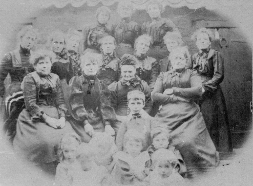 at front: Ettie Cunningham (child with lace collar); Winifred Kelly; Nelly English (baby); Fanny Short; Cissie Brennan (baby on Sarah's knee)