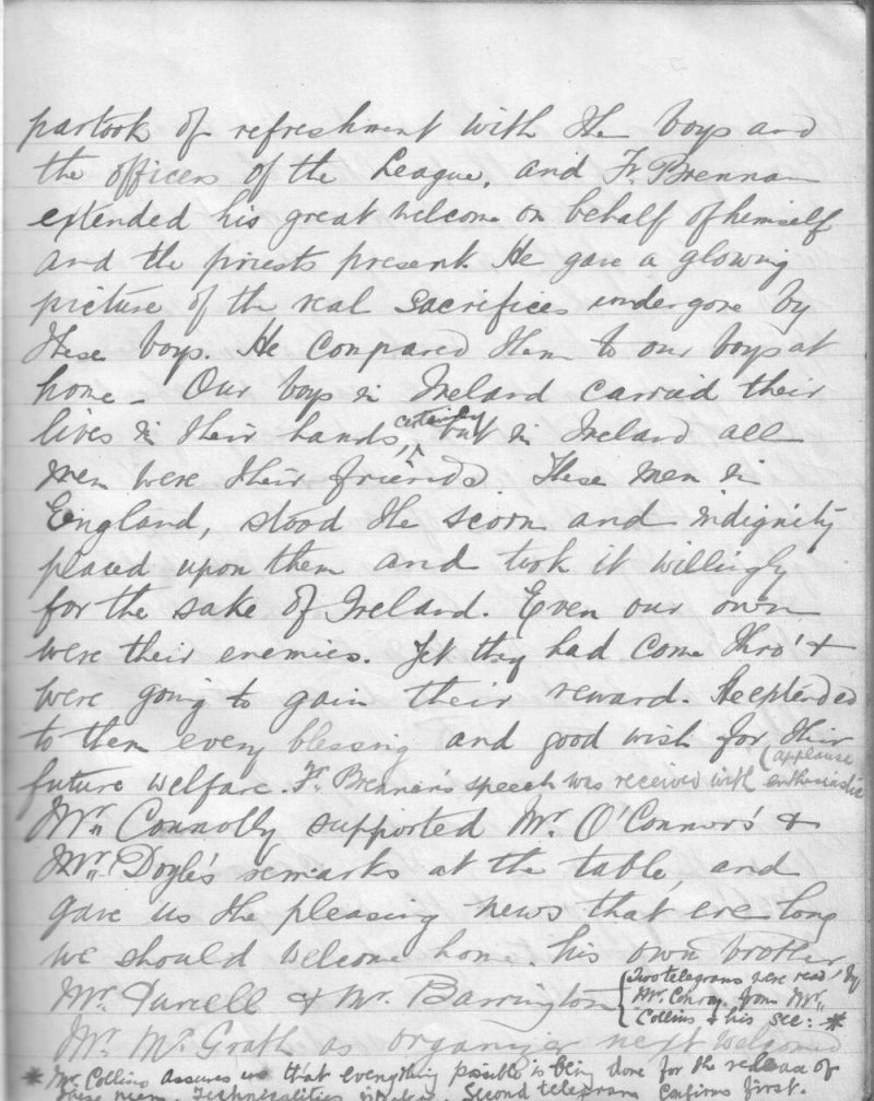 The following images are extracts from the minute book of the Jarrow Branch of the Irish Self-Determination League. They report on a reception for released prisoners held on or around 24th February 1922. Among those released were James Conroy, John McAlinden, Ed Kerrigan and Michael Wynne. A telegram from Michael Collins was read out to the meeting assuring that everything possible was being done to secure the release of other local men, Gilbert Barrington and Richard Purcell included, who were still being held in prison. They were eventually released on 3rd April 1922.